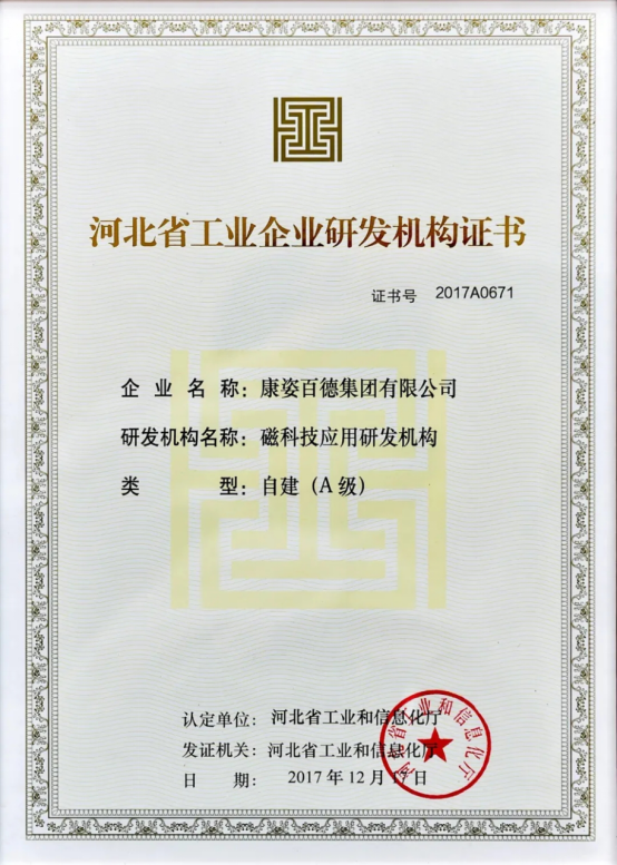 康姿百德在研发经费占比、在研项目数量、知识产权产出等方面均远超河北省工业和信息化厅的基本要求,展现出系统化、规模化的研发实力。该荣誉充分说明了康姿百德在磁应用技术领域的领先地位,是对康姿百德在磁科技领域所做贡献的认可。