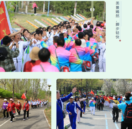 各支队伍如长龙般蜿蜒前行,有序出发。春日的园博园里,丁香与海棠交织成锦缎。大家沿途彼此加油鼓劲,结伴前行,嘹亮的歌声在花丛间回荡。